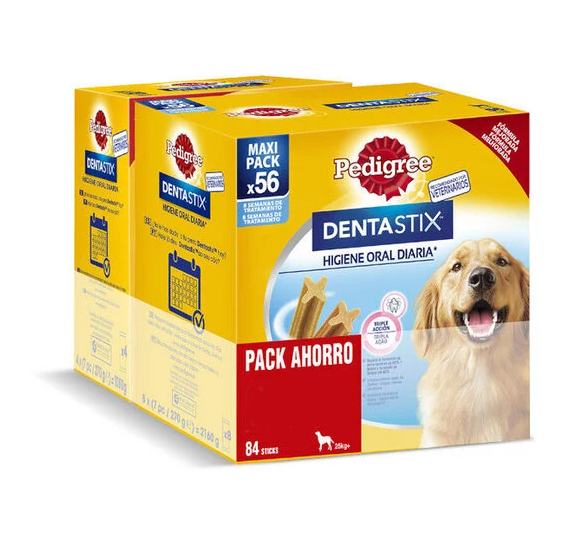 Cuida la salud bucal de tu perro de forma sabrosa y eficaz con el Maxi Pack Dentastix Higiene Dental. Diseñados para perros medianos y grandes, estos snacks en forma de X ayudan a reducir hasta un 80% la formación de sarro con su uso diario.